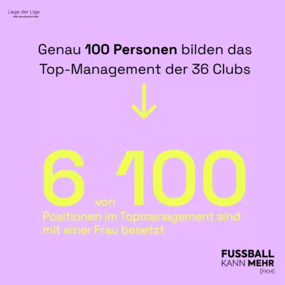 6 von 100 Positionen im Topmanagement sind mit einer Frau besetzt. Mit 94 Prozent ist die deutliche Mehrheit männlich, wie zuletzt sind sechs Frauen (6 Prozent) auf vier Clubs verteilt. Das heißt umgekehrt: 32 Clubs haben keine Frau auf der höchsten Führungsebene.