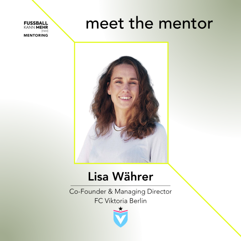 Die Mentorin für Mai ist Lisa Währer. Im Sommer 2022 übernahm sie gemeinsam mit fünf weiteren Frauen das Regionalligateam der Frauen des FC Viktoria Berlin mit dem Ziel den Berliner Frauenfußball in die Bundesliga zu führen und den Frauensport in ganz Deutschland nachhaltig zu verändern – mit Erfolg! Der Verein ist gerade aufgestiegen. Lisa ist Expertin in den Bereichen Sportmarketing und strategische Geschäftsentwicklung und hat langjährige Erfahrung bei renommierten Unternehmen wie Jung von Matt/SPORTS und Onefootball gesammelt. Seit fast drei Jahren arbeitet sie als Managing Director bei FC Viktoria Berlin. Der Job ist für sie Privileg und berufliches Highlight zu gleich, kann sie dabei doch ihreSkills aus dem Sportbusiness in den Unternehmensaufbau einbringen und jeden Tag zeigen, dass Frauen auf und neben dem Spielfeld einen Platz haben.