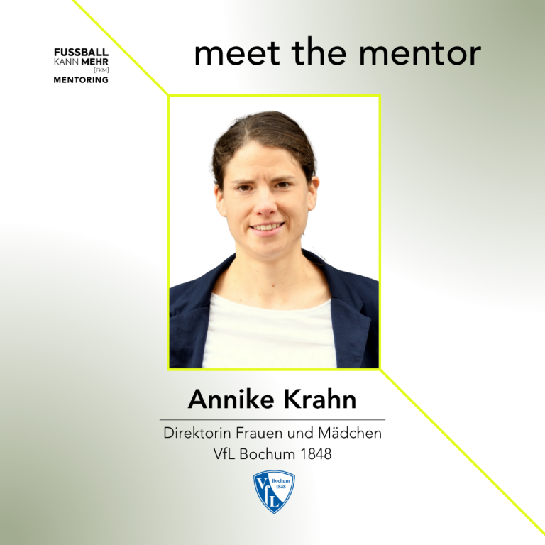 Die Mentorin für Juli ist Annike Krahn. Als Direktorin Frauen und Mädchen beim VfL Bochum 1848 GmbH & Co. KGaA vertritt sie als eine von wenigen die Praxis aus dem Frauenfußball im Management. Denn als aktive Spielerin konnte sie zahlreiche nationale und internationale Erfolge feiern. Trotzdem betont Krahn, dass persönliche Auszeichnungen nicht die Motivation für ihre Arbeit darstellen. Für sie ist Fußball Lebensinhalt und sie freut sich, nach ihrer aktiven Karriere nun den Fußball der Frauen mitzugestalten. Denn die Spielerinnenvergangenheit hat sie geprägt und zu einer Führungsperson gemacht, die als Arbeiterin vorangeht. Die Mannschaftserfahrungen spiegeln sich in ihrer Wertschätzung für vielfältige Perspektiven und Ansätze im Team und ihrem Wunsch, die Beteiligten kommunikativ einzubinden und gemeinsam auf ein Ziel hinzuarbeiten.